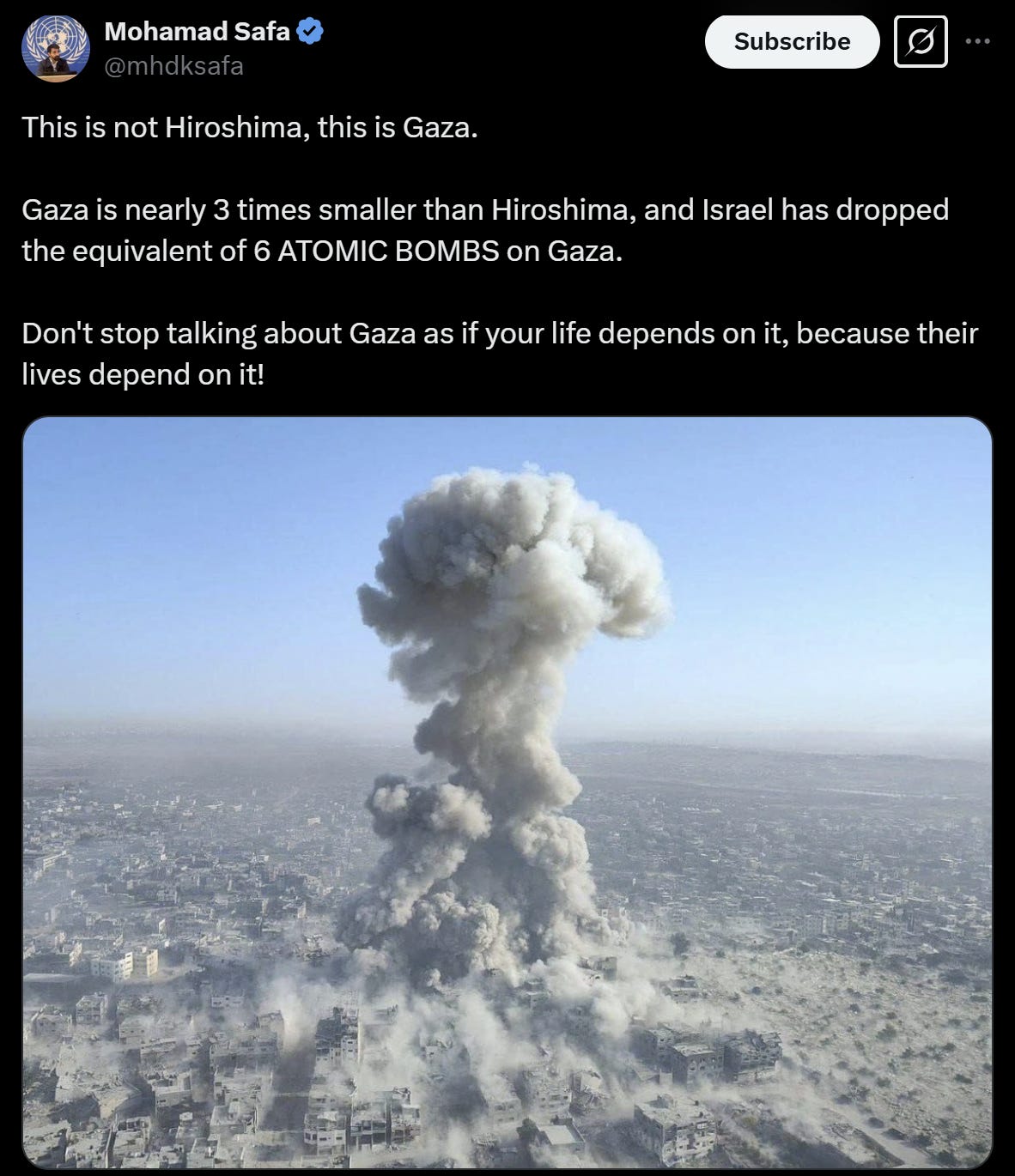 Palestinians are being intentionally massacred, starved, and stripped of everything needed to sustain human life. There are no words that can adequately convey the pain and depravity of this aggression. Those who cannot be moved by the pictures of dismembered and charred corpses will not be moved by some words. What sort of world have we descended into?
