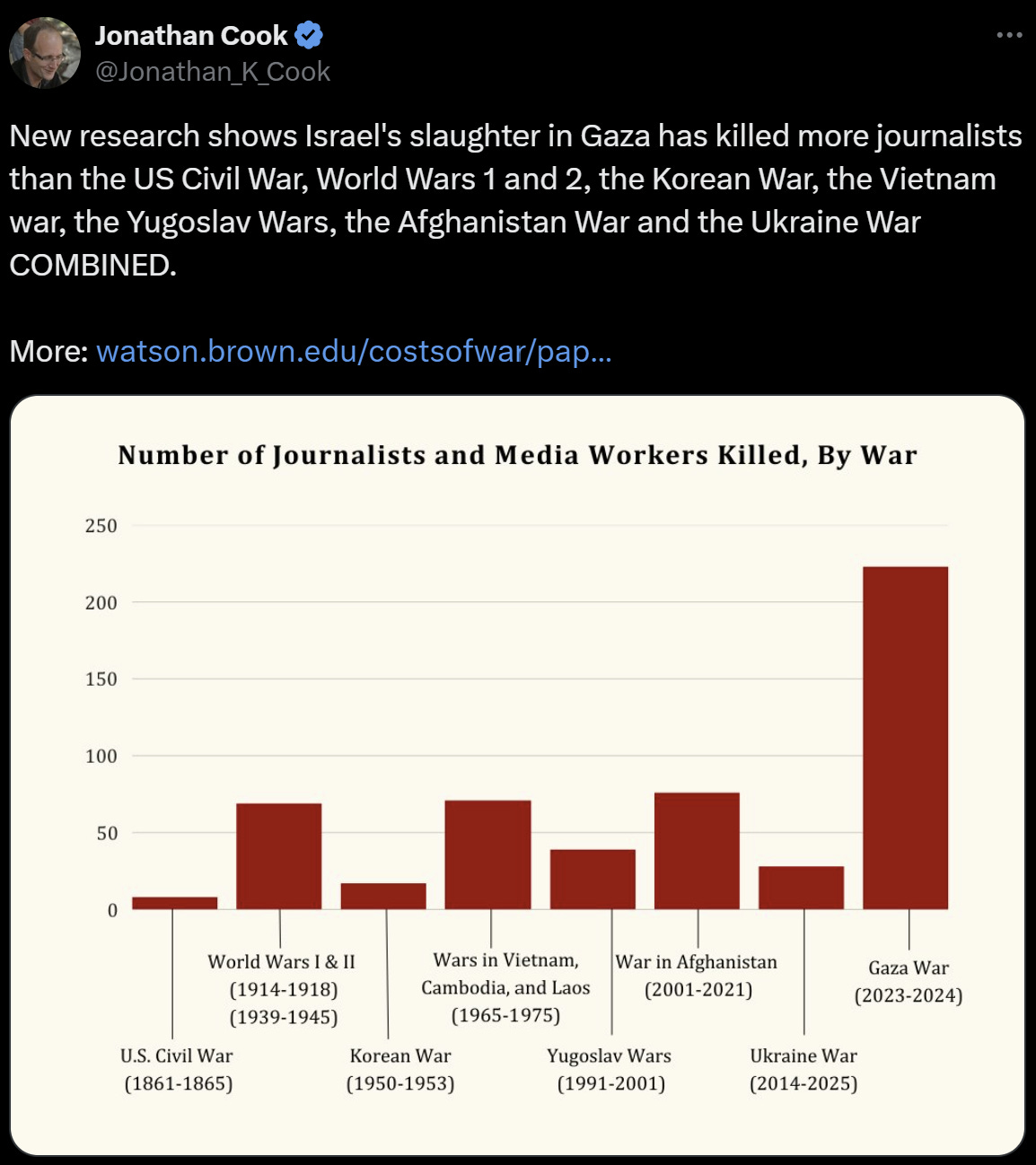 It doesn’t help that Israel has murdered approaching 250 journalists since October 2023, making this the deadliest period for journalists on record, and arrested many others.